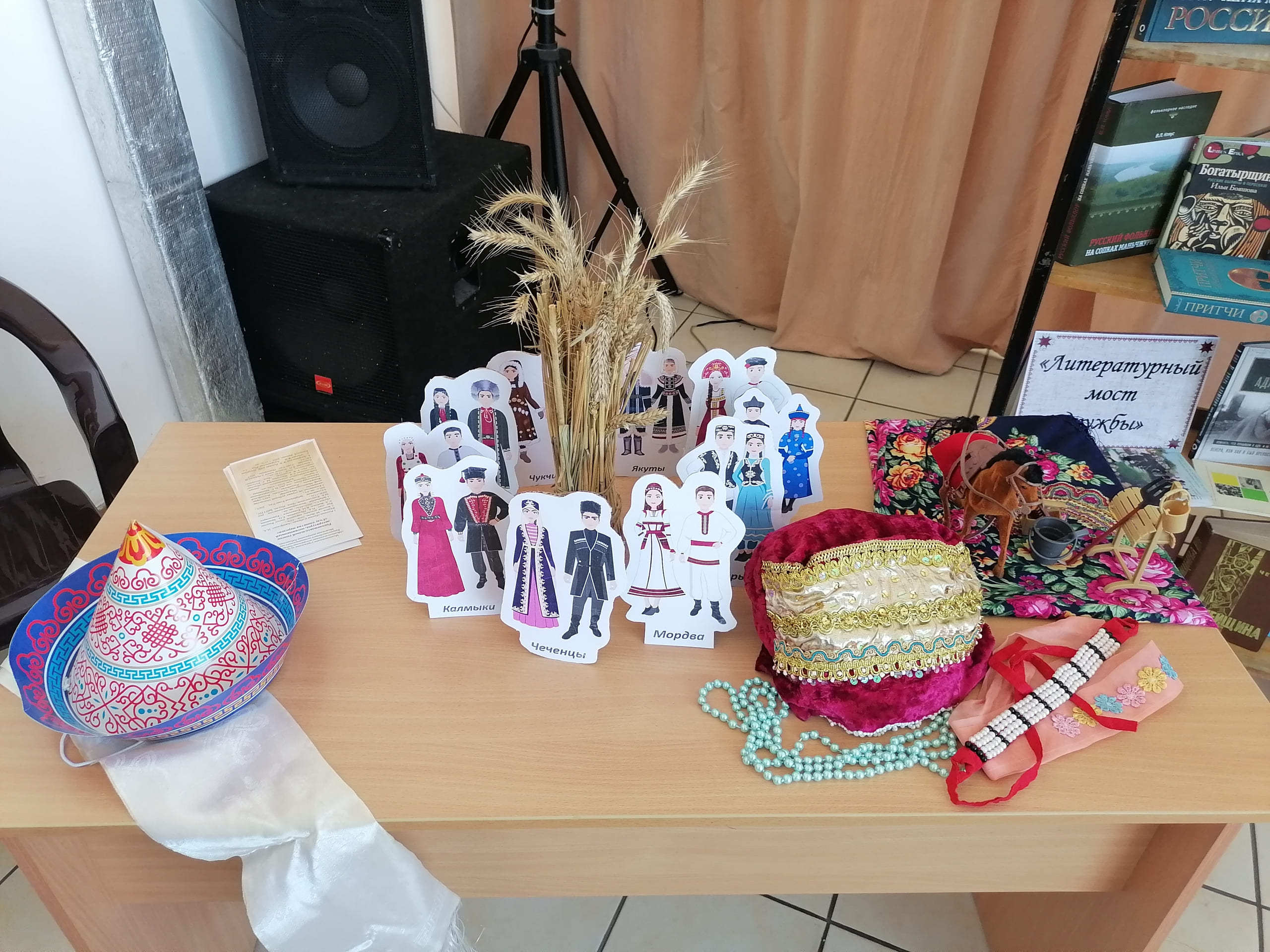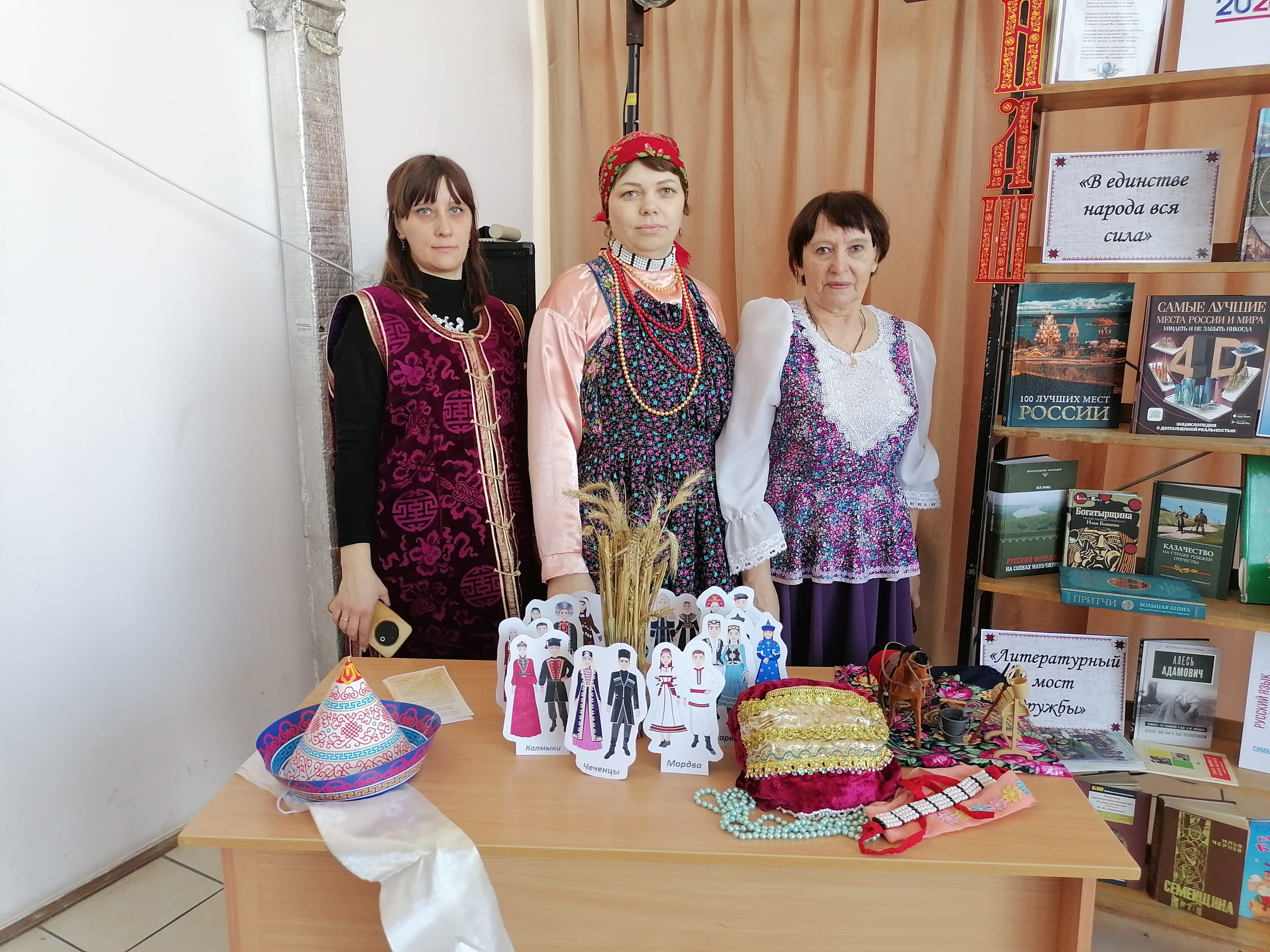 Библиотекари, одетые в национальные костюмы, раздавали флаеры с информацией о клубных формированиях и рекомендательным списком литературы по году «Единства народов России».
